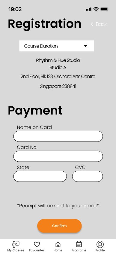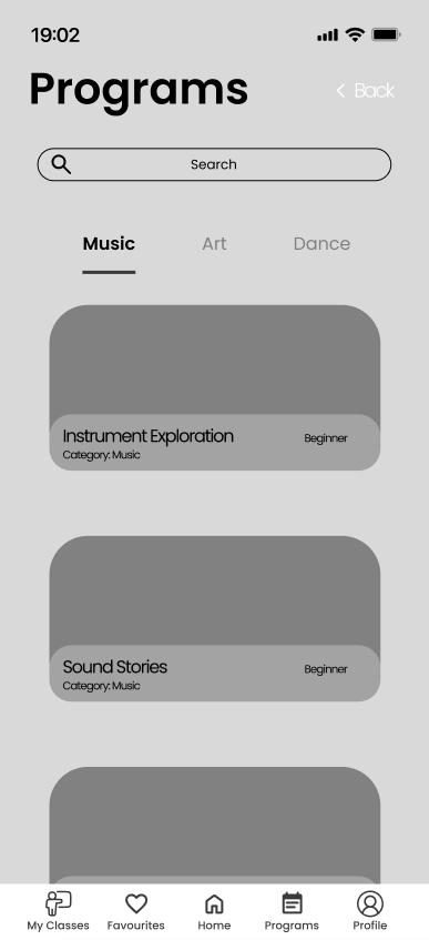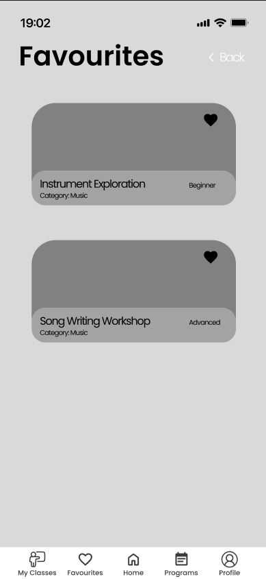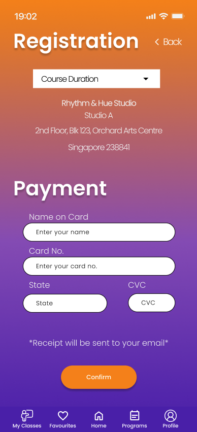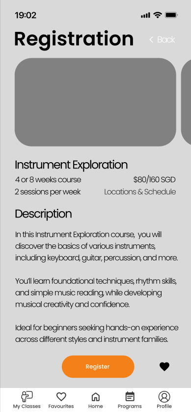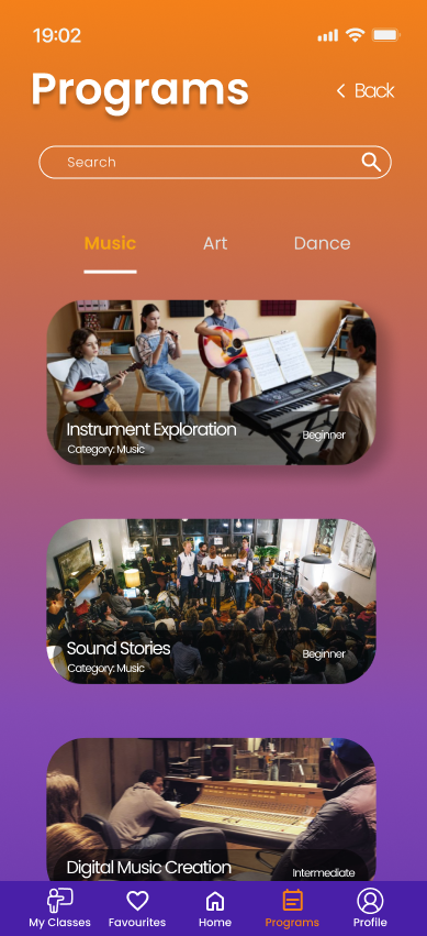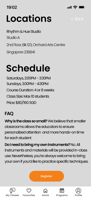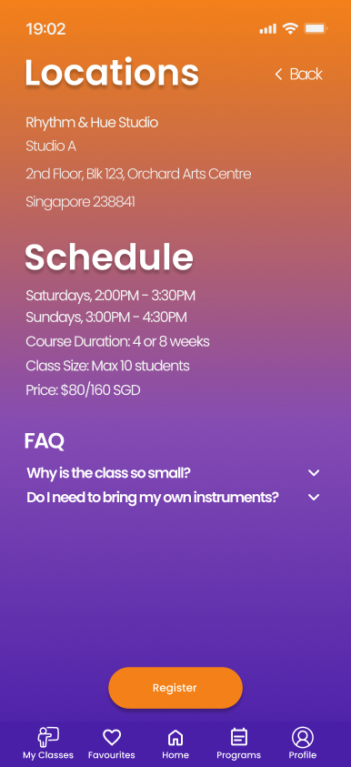 The mobile application should consist of FOUR (4) pages – Home, Programs, My Classes, and Booking/Cancellation. It should allow users to browse, filter, and search programs of their choice via attributes including program, day and time. Users can view their booked classes too.