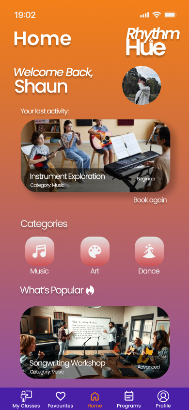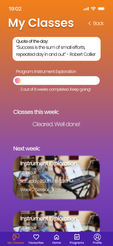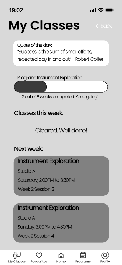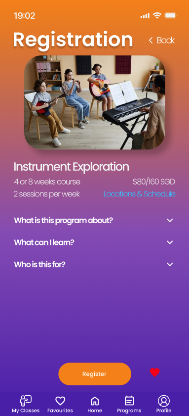 An enrichment centre offers various programs for young adults, including music, art, and dance. Design a mobile application that allows the young adults to view their registered class/es, the schedule and venue.